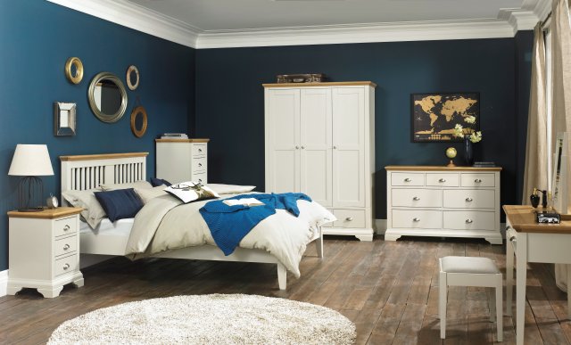Traditional in style with a contemporary feel, this two tone bedroom range subtly combines a warm, soft grey paint finish with the soft, natural tones of American oak veneered tops.